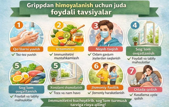Gripp — virusli kasallik bo‘lib, ayniqsa kuz va qish mavsumida keng tarqaladi. U yuqori isitma, holsizlik, yo‘tal va tomoq og‘rig‘i bilan kechadi. Quyidagi foydali tavsiyalar grippdan himoyalanish va sog‘lig‘ingizni asrashga yordam beradi.