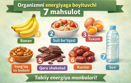 Kun davomida tez charchash, holsizlik va diqqatning pasayishi ko‘pincha noto‘g‘ri ovqatlanish bilan bog‘liq bo‘ladi. To‘g‘ri tanlangan oziq-ovqat mahsulotlari organizmni tabiiy energiya bilan ta’minlaydi, ish unumdorligini oshiradi va umumiy sog‘liqni yaxshilaydi. Quyida organizmni energiyaga boyituvchi 7 ta foydali mahsulot bilan tanishing.
