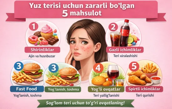 Yuz terisi inson tashqi ko‘rinishining eng muhim qismi hisoblanadi. Noto‘g‘ri ovqatlanish va ayrim zararli mahsulotlarni ko‘p iste’mol qilish terida husnbuzar, qurish, yog‘lanish va erta qarish belgilariga olib keladi. Ushbu maqolada yuz terisi uchun zararli bo‘lgan 5 ta asosiy mahsulot haqida batafsil ma’lumot beramiz.